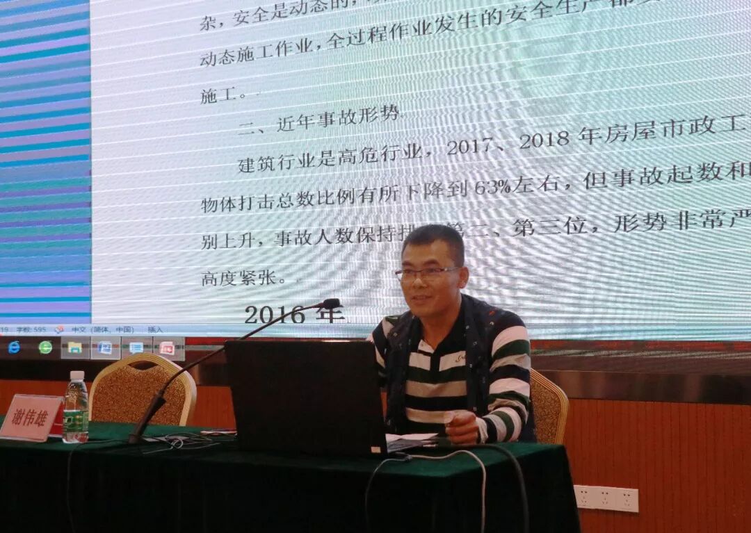 谢站长用详实的数据分析近些年全国各类型的安全生产事故,简要地阐述施工现场的安全防护的重点部位。此外还给我们普及了海因里希法则,明确事故——事件——危险之间存在关联性,并提醒参会人员提高自身业务水平,按照规范加强对安全控制点的管理。